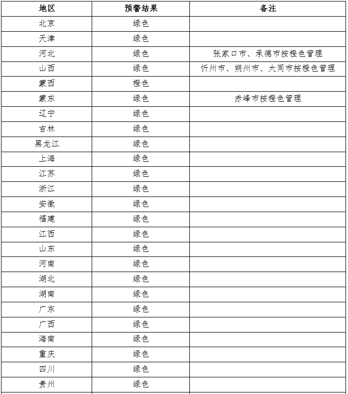 2020年风电投资监测预警结果如下:新疆(含兵团)、甘肃、蒙西为橙色区域;山西北部忻州市、朔州市、大同市,河北省张家口市和承德市、内蒙古赤峰市按照橙色预警管理;甘肃河东地区按照绿色区域管理;其他省(区、市)和地区为绿色区域,具体见附件1。