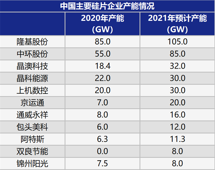 统计数据显示,2020年中国硅片企业的整体产能利用率仅约七成,合计产能约235.2GW,但最终产量却仅有167.7GW。在这样的情况下,2021年的预计产能还要比2020年扩增50%以上。