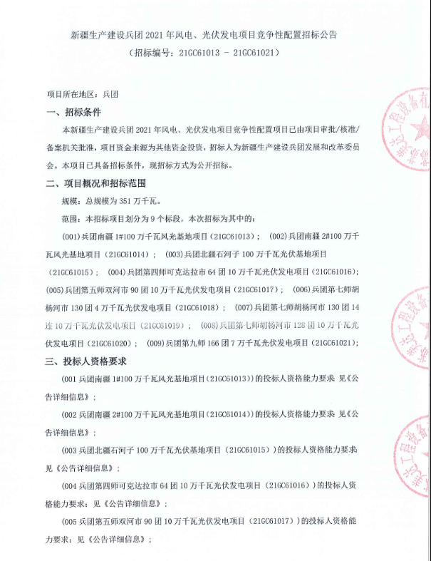 3.51GW!新疆2021年风电、光伏发电项目竞争性配置招标公告