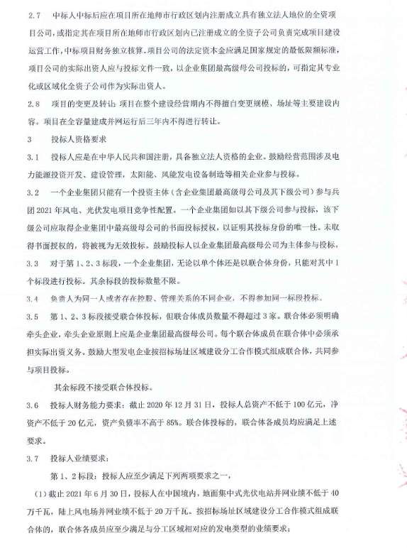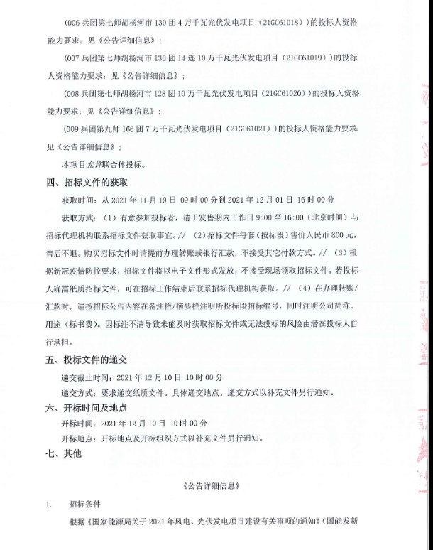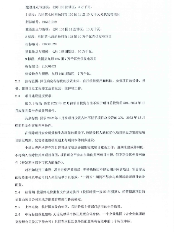 11月19日,新疆生产建设兵团发布2021年风电、光伏发电项目招标公告。此次,招标总规模3.51GW,共分为9个标段,、兵团南疆1#100万千瓦风光基地项目、兵团南疆2#100万千瓦风光基地项目、兵团北疆石河子100万千瓦光伏基地项目、兵团第四师可克达拉市64团10万千瓦光伏发电项目、兵团第五师双河市90团10万千瓦光伏发电项目、兵团第七师胡杨河市130团4万千瓦光伏发电项目、兵团第七师胡杨河市130团14连10万千瓦光伏发电项目、兵团第七师胡杨河市128团10万千瓦光伏发电项目、兵团第九师166团7万千瓦光伏发电项目。