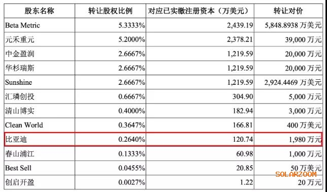 2020年9月,天眼查显示,阿特斯发生工商变更,公司20.41%股权转让给了12位投资人。其中既有公司的员工持股平台,也有比亚迪(002594.SZ)这样的新能源巨头,还有一批外部投资基金。