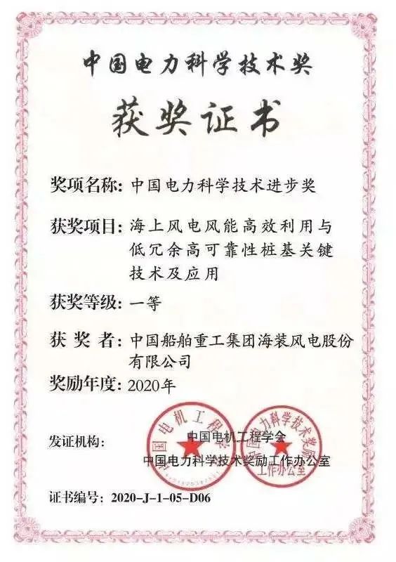 由华能国际电力股份有限公司江苏清洁能源分公司牵头,中国海装参与的《海上风电风能高效利用与低冗余高可靠性桩基关键技术及应用》项目荣获二O二O年度中国电力科学技术进步一等奖。