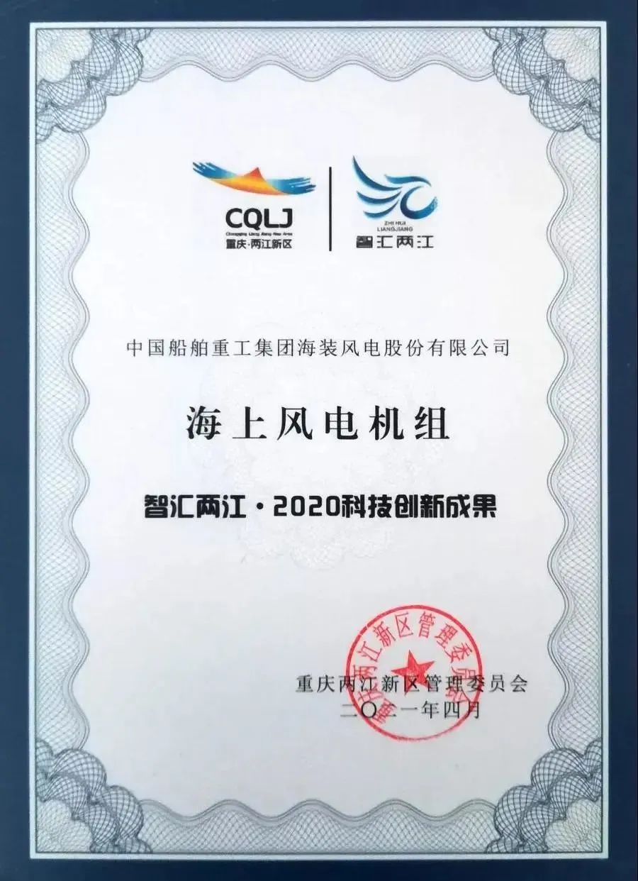 4月20日,重庆两江新区召开智汇两江·2020科技创新年度发布会。中国海装获“智汇两江·2020科技创新企业”;中国海装海上风电机组被评为“智汇两江·2020科技创新成果”。