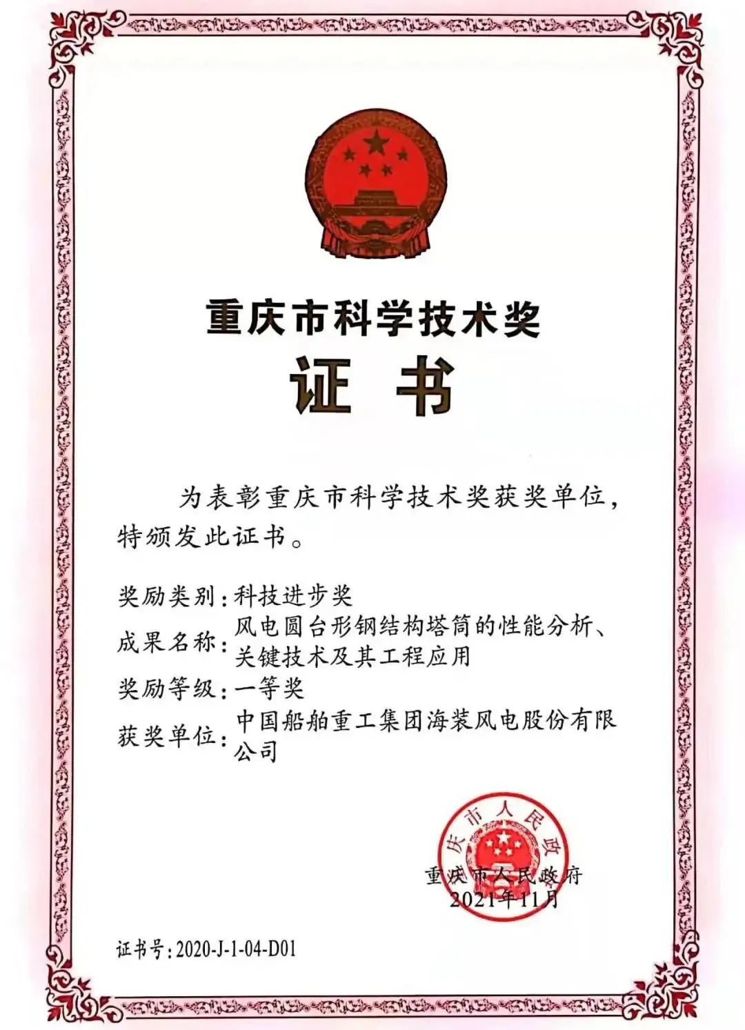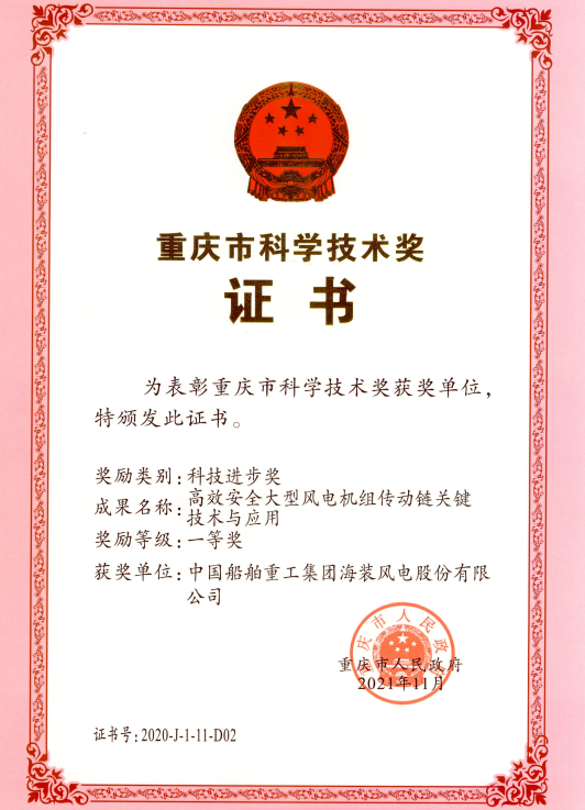 11月19日,重庆市科学技术奖励大会隆重举行。中国海装申报的两个项目《风电圆台形钢结构塔筒的性能分析、关键技术及其工程应用》与《高效安全大型风电机组传动链关键技术与应用》均荣获重庆市科学技术奖科技进步奖一等奖。