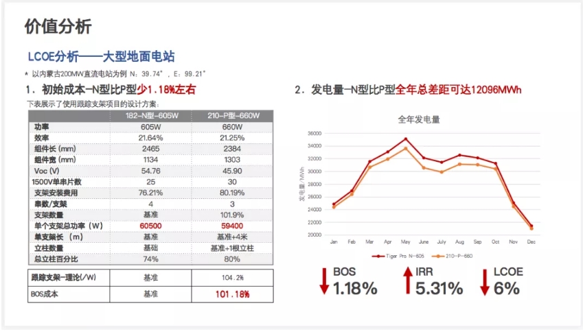 以内蒙某200MW电站为例,Tiger Neo-605W与常规210PERC产品660W对比来看,其BOS成本可降低1.18%左右,度电成本下降6%,IIR可提高5.31%。丛秋实表示,目前主流支架厂家、逆变器厂家的相关产品已经可以全面适配以N型组件构建的光伏系统。