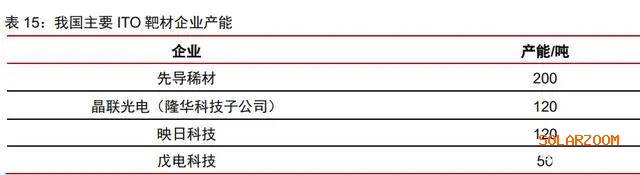 靶材是 TCO 薄膜沉积的关键,ITO 靶材为最佳选择。不论是 PVD 工艺还是RPD工艺,靶材都是必不可少的材料。目前市场化的靶材有 AZO 和 ITO 等。AZO材料价格较为经济,但其导电性较 ITO 相差较大,通过厚镀膜来弥补导电性将极度降低光的透过率,将 大幅降低电池特性。ITO靶材就是氧化铟和氧化锡粉末按一定比例混合后经过一系列的生 产工艺加工成型,再高温气氛烧结(1600度,通氧气烧结)形成的黑灰色陶瓷半导体,通过 调整氧化铟和氧化锡粉末的比例,可以提高 HJT 电池的转换效率。