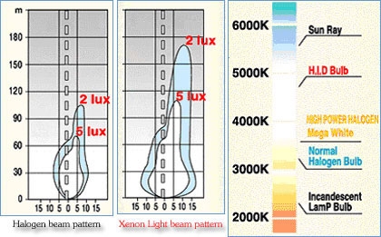 8000K以上蓝光,穿透力极差推荐6000K左右的色温正好是最白略微开始转蓝的色温,人眼容易接受,不易疲劳,提高安全性,而卤素灯则较差。