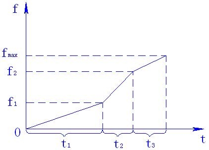 图1非线性加减速曲线 整个加、减速过程分为三段,f1、f2可以在0~fmax之间任意设定,t1 、t2、t3可以在0~3600之间任意设定。 5. 跳转频率 风机水泵设备,制造时均按照额定转速较核振动,当设备投入调速运行后,有可能某些转速下进入机械共振区,造成机械的损坏。在机械系统具有共振频率的情况下, 利用变频器的跳转频率功能, 可以避免因使用传动装置而出现机械共振及由此产生的问题。现场调试时,要逐点检查0至最大频率点的机械振动情况,将振动值超过允许范围的运行点输入变频器中,这样变频器就可以在振动点外运行。 共振点跳转频率的合理设置,避免了风机、水泵负载长期在共振点运行,使风机工作平稳,风机轴承磨损减少,延长了电机、风机的使用寿命和维修周期。