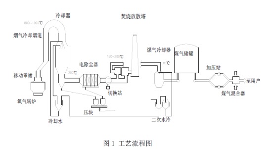 通过蒸发冷却把约1000℃的烟气降温到约250℃并对烟气进行粗除尘,然后通过防爆型静电除尘器对烟气进行精除尘,然后烟气通过风机切换站进入烟囱排放或进入煤气冷却器对烟气进一步降温后回收利用。工艺流程见图1所示。