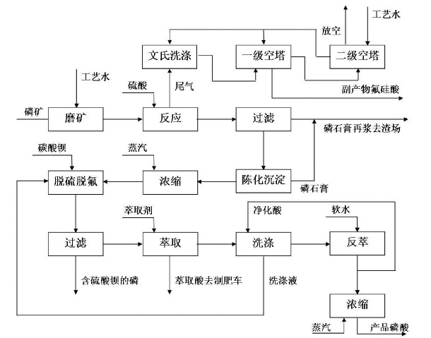 磷矿与硫酸萃取→稀磷酸→浓缩→浓磷酸→预处理→萃取→洗涤→反萃→浓缩→产品酸。具体见图1。