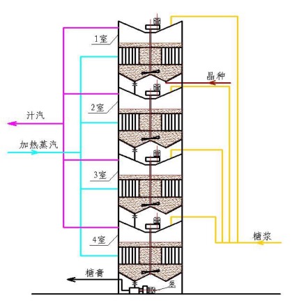 罐具有煮糖所需蒸汽压力较低、各个结晶室过饱和度控制稳定、可实现长时间不 停机清洗、晶体质量均匀、占地面积少等优点,因此可广泛应用于我国的制糖行