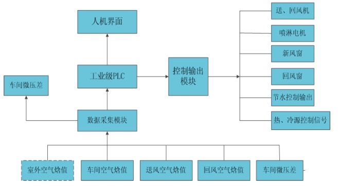 根据回风温湿度与设定值的参数偏差,通过CPU的控制算式,自动分析确定控制送风温度、回风温度在要求的控制范围内,以满足生产工艺及舒适度要求。