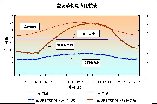 实测表明普通土建房屋通过墙体散失的热量占据热量损耗的50%多,窗户和门的热量损失占据40%多的热量损耗。因而户外机房的保温材料制作,特制的保温防盗门窗设计很好的解决了热量损失的问题。 图四为我们在某基站的实测数据对比,可以看出户外机房的明显的节能作用,平均具有20%以上的节能效果。