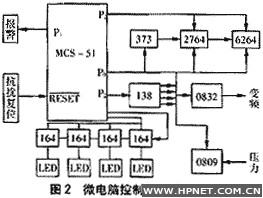 其中,0809(为A/D转换)用以采样水泵出口压力;0832(为D/A转换)用于控制变频器以调整水泵转速,串口定为方式0,扩展为用来实现4位数码管显示;2764及6264为扩展的程序存储器及数据存储器,2764存放程序及智能压力设定的有关表格。